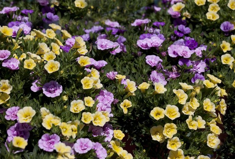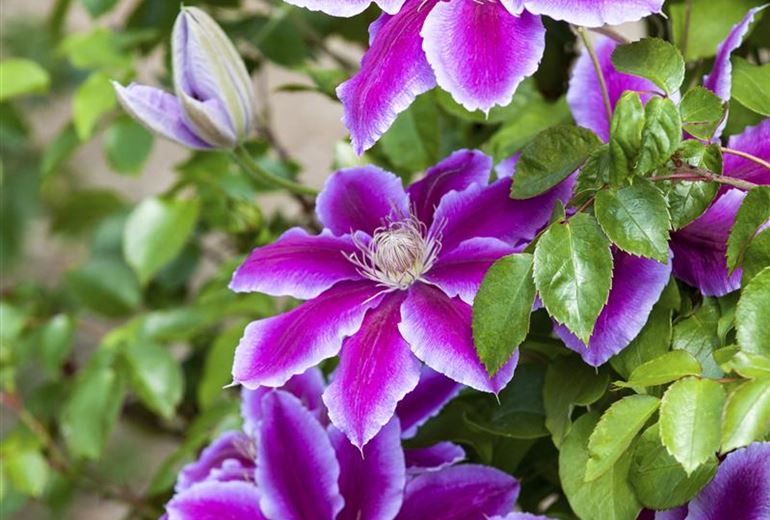 Einen Hang ins Rätselhafte bringt die Farbe Violett mit. Die grosse Blüte der Clematis ist wie geschaffen für magische Gartenecken. Das aus der gleichen Farbfamilie stammende Pink leuchtet stärker und wirkt ungemein attraktiv, wie man bei Malven gut sehen kann. Effektvolle, harmonische und unübersehbare Kombinationen ergeben sich mit zartem Gelb und Orange. Lila ist anpassungsfähig und in viele Arrangements integrierbar. Ein Beispiel ist der kugelige Zierlauch.