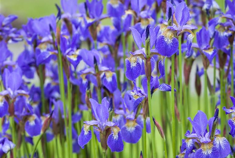 Ganz das Gegenteil von diesem Knalleffekt bewirkt die Farbe Blau. Ihre Kühle erzeugt Weite und schenkt Ruhe. Tiefe Blautöne vermitteln Vertrauen und signalisieren Verlässlichkeit. Grosse Flächen können auch Sehnsüchte wecken und einen Hauch von Mystik mit sich bringen, zum Beispiel wenn der Blaustern sich weitläufig durch den Steppengarten ausbreitet. Schwertlilien und Herbstastern sind mit herrlichen blauen Blüten vertreten und bieten viele Möglichkeiten für Beete und Rabatten. Wunderbare ruhige Inseln dazwischen entstehen mit dem Blauschwingel. Eine Kombination mit Weiss erfrischt und entspannt zugleich, zum Beispiel in der ganz einfachen Zusammenstellung von blauem und weissem Rittersporn. Ein Zusammenspiel mit der komplementären Farbe Gelb bringt spannenden Kontrast ins botanische Geschehen. Mädchenauge und Sonnenhut bieten sich hier an.