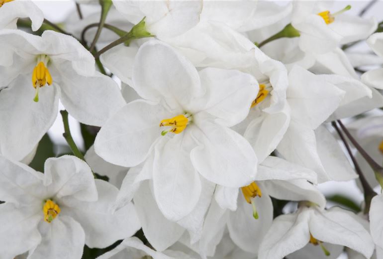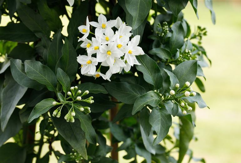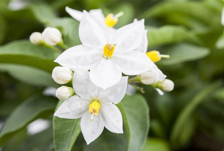 Dass der Sommerjasmin zu den Nachtschattengewächsen gehört ist in Anbetracht der wunderschönen Blüten der Pflanze absolut unverständlich. Die weissen Blüten haben nichts mit einem Nachtschatten gemeinsam.