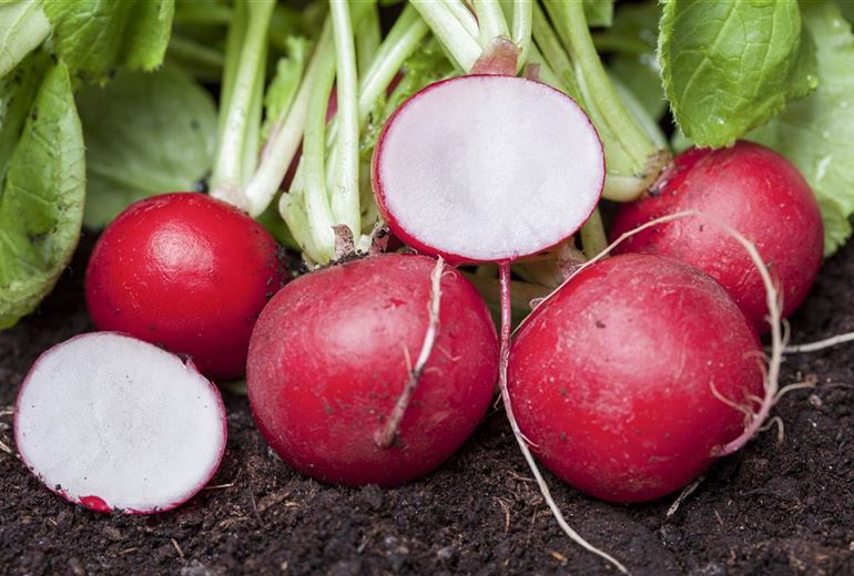 Wenn es beim Keimen und Wachsen von Gemüse ein Wettrennen gäbe, dann stünde das Radieschen jedes Mal siegessicher auf Platz Eins. Innerhalb von 6-10 Tagen keimt das Wurzelgemüse und ist nach ca. 4-5 Wochen erntereif. Die Aussaat erfolgt von Mitte März bis September direkt ins Freiland. Die knackigen Leckerbissen gibt es nicht nur in Rot und rund; probieren Sie doch auch mal zweifarbige Sorten in Rot-Weiss, längliche in Zapfenform oder eine mehrfarbige Mischung mit gelben, violetten und weissen Radieschen.