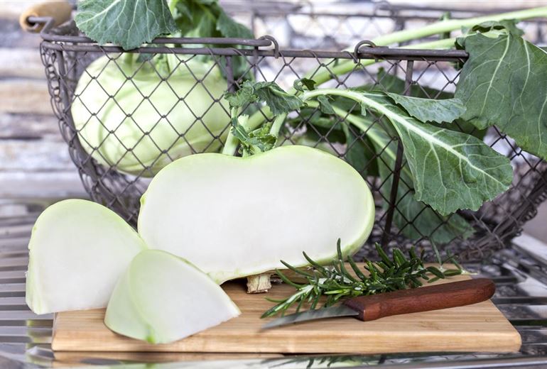 Kohlrabi überzeugt ebenfalls durch eine kurze Entwicklungszeit (Keimdauer 6-10 Tage). Die Kohlpflanze mit verdickter Sprossknolle wird entweder ab März im Warmen vorgezogen und ab April ins Freie gepflanzt oder ab Mitte April unter Folie direkt ins Beet gesät. Sie können zwischen weissen (hellgrünen) und blauvioletten Sorten wählen, wobei die weissen meist eine kürzere Kulturzeit haben.