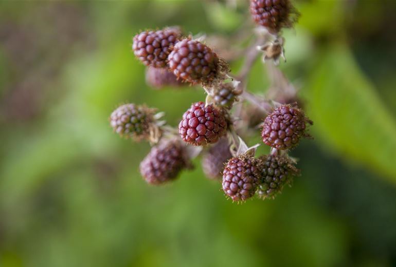 In der freien Natur sind Brombeeren wahre Selbstläufer. Und weil sie so munter wachsen, sollten sie im eigenen Garten ein bisschen unter Kontrolle gehalten werden. Das geht am besten mit einer Rhizomsperre. Da Brombeeren relativ flach wurzeln, reicht es aus, wenn die Sperre bis 30 Zentimeter tief gesetzt wird. Dafür eignet sich zum Beispiel ein übrig gebliebenes Stück Teichfolie. Damit sich reichlich Früchte bilden, möchte die Brombeere immer gut feucht gehalten werden. Man sollte also nicht warten, bis der Boden ausgetrocknet ist, sondern regelmässig zugiessen, wenn der Regen ausbleibt. Ein Bisschen ist es mit Brombeeren im Garten wie mit Kindern: Erziehung liegt im Auge des Betrachters. Da Brombeeren sehr wuchsfreudig sind, sollte man die Pflanze erziehen, muss es aber nicht. Da der Aufwand der Erziehung relativ hoch ist, muss man selbst abwägen, ob man sie einfach wachsen lassen will, oder kontrolliert an einem Spalier. Wer sich für die Erziehung entscheidet, sollte sich beim Kauf der Pflanzen beraten lassen. Zwischen aufrechtwachsenden und eher niedrigwachsenden Arten gibt es bei der Erziehung nämlich Unterschiede. Aber für jede Pflanze gilt nach der Ernte: die abgeernteten Ruten der Brombeere werden spätestens im Winter auf Bodenhöhe abgeschnitten. So steckt die Pflanze ihre ganze Energie in die neuen und jungen Ruten.