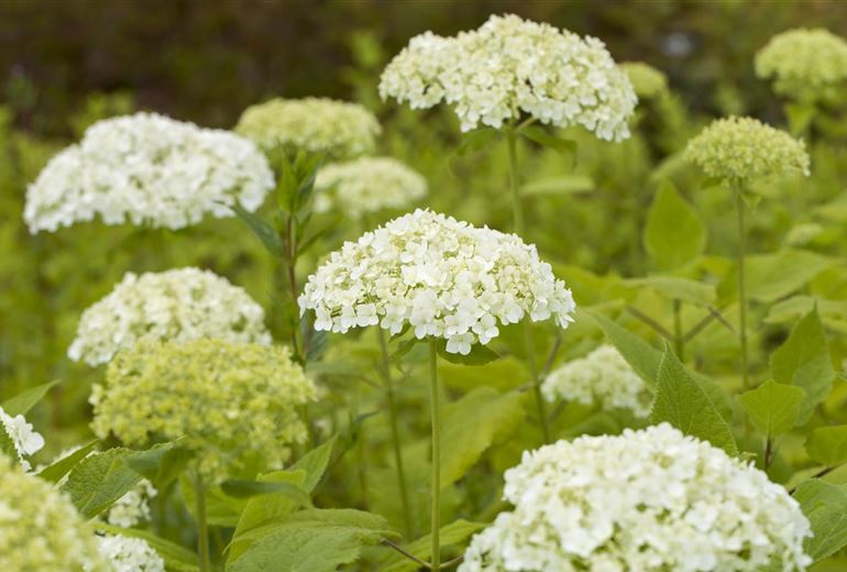 Die winterharte Schneeball- oder Waldhortensie gehört zu den grossen Hortensienarten mit fulminanten Blüten. Sie wächst als buschiger, lockerer Strauch, der bis zu drei Meter hoch wird. Die weissen, kugeligen Dolden sind so schwer, dass die Zweige oft bis zum Boden durchhängen. Der Gartenbesitzer gönnt ihr am besten eine Stütze. Auch die robuste Rispenhortensie übersteht den Winter im Freien. Imposant sind ihre handtellergrossen, gestielten Blätter mit der flaumartigen Behaarung. Die weissen oder cremefarbenen Rispenblüten erinnern an den zarte Flor von Flieder. Noch im Verblühen schön, wenn sie in rosarote bis purpurviolette Farbnuancen übergehen! Bienen und Schmetterlinge lieben die bis zu zwei Meter hohe Pflanze. Beide Hortensienarten mögen Halbschatten und tolerieren Sonne.