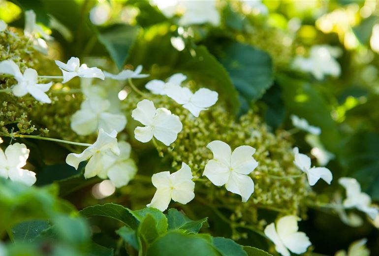 Die Kletterhortensie ist zwar die langsamste unter den Hortensienarten, wächst aber unermüdlich. Mit ihren Luftwurzeln haftet sie an jedem Untergrund. Ihre flachen, weissen Dolden erreichen 25 Zentimeter Breite. Ideal für schattige Fassaden geeignet! Herrlich rotes Laub zeigt die Eichenblättrige Hortensie im Herbst. Vorher präsentiert der bis zu zwei Meter hohe Strauch weissen Flor, der sich im Verlauf des Sommers rosa färbt. Von Sonne bis Schatten ist ihm alles recht. Als Rarität unter den Hortensienarten ist die Samthortensie einzuordnen. Der zwei bis vier Meter hohe Strauch besitzt überdimensionale Blätter mit samtigem Haarbewuchs. Sein ungewöhnlicher, faszinierender Flor besteht aus kleinen, fruchtbaren und grossen, unfruchtbaren Scheinblüten mit insgesamt ca. 20 Zentimetern Breite. Er strömt zarten Duft aus. Die Schönheit möchte im Halbschatten und geschützt stehen.