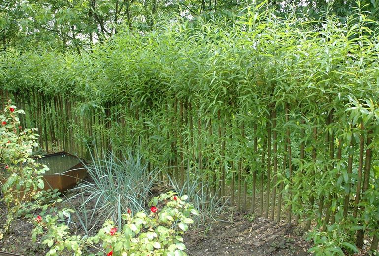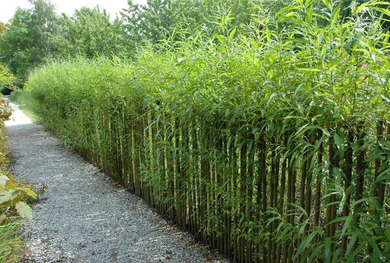 Sofern ein möglichst stabiler Zaun oder auch Sichtschutz aus Weiden errichtet werden soll, werden rund 5 bis 10 cm dicke Weidenäste benötigt. Die Länge der Äste sollte ungefähr 50 bis 70 cm länger als die gewünschte Zaunhöhe sein. Denn zunächst wird ein etwa 20 bis 30 cm tiefer Graben ausgehoben. Dort werden die Weidenäste in einem Abstand von ungefähr einem Meter auf die endgültige Höhe des Zaunes eingeschlagen. Die Einschlagtiefe sollte circa 30 bis 40 cm betragen. Zwischen diese Äste werden im Abstand von 15 bis 30 cm dünnere Ruten über Kreuz gesteckt. Dadurch wird ein besseres Anwachsen gewährleistet. Anschliessend den Graben mit Erde füllen und festtreten. Damit bereits am Anfang ein recht dichter Zaun entsteht, können waagrecht lange Ruten zwischen die senkrecht stehenden eingeflochten werden. Auch der Neuaustrieb der Ruten kann laufend miteinander verflochten werden. Wenn die neu ausgebildeten Triebe zu grosse Ausmasse annehmen, können sie mit einer Heckenschere zurückgeschnitten werden. Um die Bewurzelung, vor allem in der Anwachsphase, sicherzustellen, ist während dieser Zeit und bei anhaltender Trockenheit ausreichendes Giessen erforderlich.