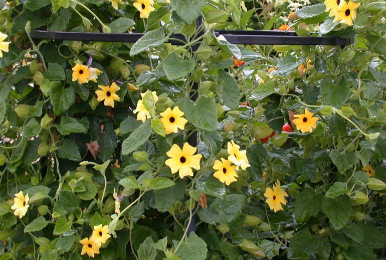 Wer sich nicht ganz sicher ist, ob er Kletterpflanzen in seinem Garten haben möchte, der kann auch Kletterprofis auf Probe in den Garten holen. Einjährige Kletterpflanzen eignen sich besonders gut für kurzfristige Begrünung mit Kletterpflanzen und in nur einer Saison breiten sie sich auf mehreren Metern rasend schnell aus. Dabei können einjährige Kletterpflanzen genauso vielfältig eingesetzt werden, wie ihre mehrjährigen Geschwister. Duftwicke, Kapuzinerkresse und Schwarzäugige Susanne eignen sich besonders gut für das Beet an einer Rankhilfe. Maurandie und Prunkwinde machen sich gut an Hauswänden und sind ein hübscher blühender Sichtschutz. Ganze Pavillons und Pergolen erklimmen in einer Saison Zierkürbis, Glockenrebe, Japanischer Hopfen und die Feuerbohne.