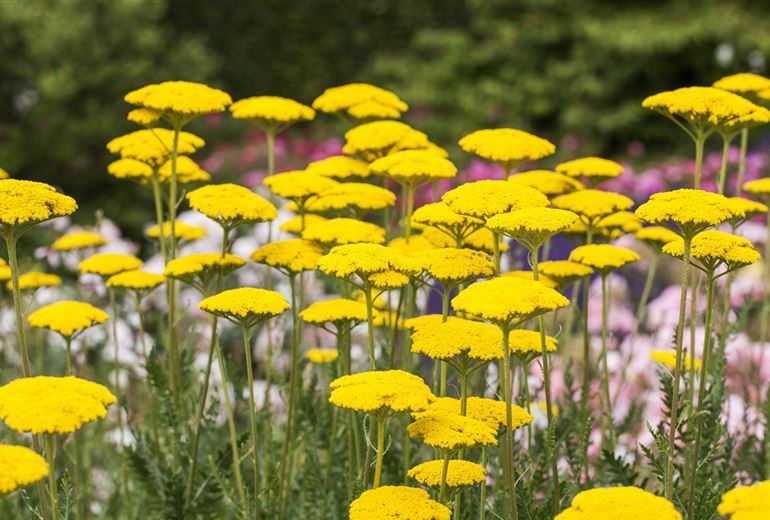 Wer es fulminant mag, kombiniert einen gloriosen silberfarbenen Blickfang, wie eine Silber- oder eine Elfenbeindistel, mit einem Goldrausch an Blütenzauber. Das kann zum Beispiel Sonnenhut oder Goldgarbe sein. Jede Blüte, die im gelben Bereich des Regenbogens liegt, unterstreicht den Goldglanz-Effekt. Hier dürfen durchaus Pflanzen wie Kamille und Frauenmantel zum Zuge kommen, die ansonsten gut in einen Bauerngarten passen. Auf die glamouröse Kombination kommt es eben an! Wer die Farben der beiden Edelmetalle Gold und Silber mutig in einen Dialog bringt, erzeugt eine grosse Energiequelle. An diesem Beet bleibt jeder stehen.
