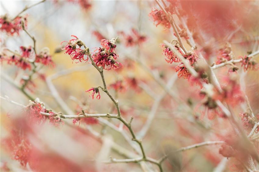 Kommen wir von weissem zu farbigem Flor. Da fällt sofort die Zaubernuss (Hamamelis) ins Auge. Kein Wintertag ist mehr öde und trist, wenn diese bizarre Schönheit blüht. Dieser prachtvolle Anblick war wohl die Ursache dafür, dass die Wünschelrutengänger sich ihre Zweige von dieser Pflanze schnitten, der sich geheimnisvolle Kräfte zusprachen. Lassen Sie eine gelb und eine rot blühende Pflanze ineinander wachsen! Ein weiterer gelber Winterblüher stellt sich mit dem Winterjasmin (Jasminum nudiflorum) vor. Bis in den Herbst hinein glänzt er mit seinem vornehmen Blattwerk, von dem er sich aber zum Winter verabschiedet. Stattdessen bietet er jetzt seine frostharten Blüten an. Auch ein Baum hat sich den frühen Winter für seine Blütezeit ausgesucht. Die Alstonia präsentiert sich am besten in grösseren Gärten und Parkanlagen, denn sie wächst recht schnell und wird auch hoch. Er prangt das Jahr über mit seinem imposanten Blattwerk und ziert sich im November mit zarten grün-weissen Blüten.