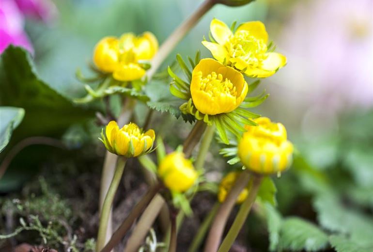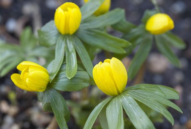 Die Knollen der Winterlinge werden 3 bis 5 Zentimeter tief in den Boden gesetzt. Halten Sie einen Abstand von 8 bis 10 Zentimetern ein: Blütenteppiche bilden die Pflanzen im Laufe der Zeit ganz von selbst. Um dem Winterling die Kältephase angenehm zu machen, können Sie die Pflanzstelle mit Kompost abdecken. Zwischen Februar und März recken die Winterlinge dann ihre Köpfe und freuen sich über eine regelmässige Versorgung mit Humus, zum Beispiel durch Laub oder weiteren Kompost. Es reicht, diesen um die Pflanze herum zu verteilen. Einarbeiten in den Boden birgt die Gefahr, die flach vergrabene Knolle freizulegen. Winterlinge kann man hervorragend mit anderen Frühblühern kombinieren. Dafür können Sie auch eine Rasenfläche nutzen. Diese sollten Sie dann allerdings nicht vor Ende Mai mähen, weil das Laub des Winterlings erst dann einzieht. Sollten Sie sich dafür entscheiden, blühende Exemplare zu kaufen, können Sie diese im Frühling direkt in den frostfreien Boden pflanzen.