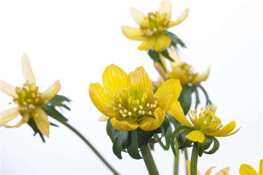 Am weitesten verbreitet ist der heimische Winterling (Eranthis hyemalis). Er stammt ursprünglich aus dem Süden Europas. Dort wächst er in Laubwäldern, Gebüschen und Weinbergen. Hierzulande wird der Winterling bereits seit 4 Jahrhunderten kultiviert. Er ist anspruchslos und pflegeleicht, das macht ihn zu einem beliebten Gartenbewohner. Ganz ohne Mühen können Sie mit Winterlingen grosse Farbflächen in Ihren Garten zaubern. Und diese kommen schon früh aus dem Boden. Bei Temperaturen knapp über dem Gefrierpunkt treiben Winterlinge aus und zeigen sich bald in ihrer vollen Pracht. Diese präsentiert sich mit 5 bis 15 Zentimetern Wuchshöhe und 2,5 Zentimeter grossen Blüten. Trotz ihrer geringen Grösse fallen Winterlinge ins Auge, weil sie dem Betrachter sonnengelb entgegenstrahlen. Die Blätter sitzen direkt unter der Blüte und hängen dort palmartig hinab. Sie wirken wie das gespiegelte Ebenbild der Blüte in saftigem Grün.