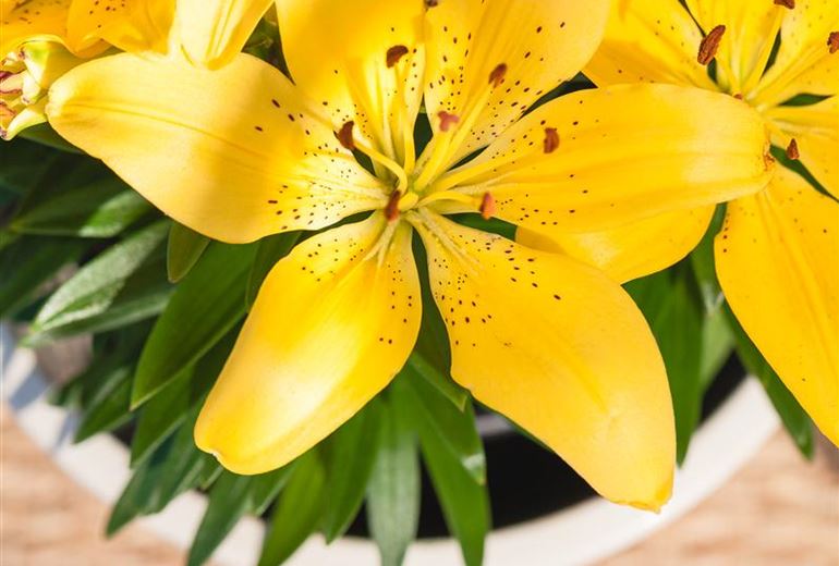 Die grossen Blüen der Lilie mögen es sonnig. Trotzdem sind sie in ihren Heimatregionen oft in Gehölz- und Wiesenbereichen zu finden. Dort ist der untere Teil der Pflanze geschützt. Dieser sollte nämlich schattiert werden. Im Garten erreichen Sie das am besten durch geschickte Pflanzenkombinationen, zum Beispiel mit einjährigen Sommerblumen oder Stauden. Ob Wiesenraute, Storchschnabel oder Grosses Schleierkraut: sie untermalen die imposanten Blüten in perfekter Harmonie. Wenn Sie den Blick nicht verstellen wollen, können Sie den Fuss der Pflanze auch mit einer Mulchschicht vor Sonneneinstrahlung schützen. Kleine Liliensorten lassen sich übrigens problemlos in Kübel pflanzen. Dabei müssen Sie vor allem auf einen geeigneten Wasserabzug achten. Im Kübel machen sich zwei bis drei Pflanzen kleinerer Liliensorten in einer Gruppe gut.