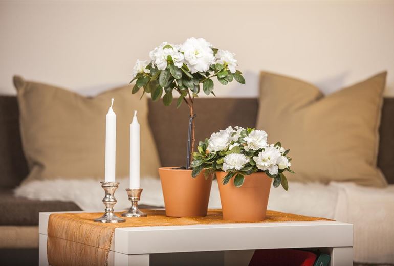 Von den pflanzlichen Mitbewohnern möchte ausgerechnet die Azalee im Zimmer viel trinken. Ihr Name bedeutet „trocken“, obwohl sie ohne genügend Wasser nicht existieren kann. Das soll man der pflanzlichen Diva bitte regelmässig zuführen, und sie hätte es gern gleichbleibend feucht. Dabei bevorzugt sie kalkfreies Wasser; von Regenwasser ist sie geradezu begeistert. Auch zu den Wärmeverhältnissen hat sie klare Vorstellungen. Bei 18 Grad hat die Azalee im Zimmer ihre Wohlfühltemperatur. Ein Aufenthalt im Wintergarten gefällig? Da sagt sie nicht nein. Sie möchte hell stehen, aber nicht direkt der Sonne ausgesetzt werden. Alle Wünsche erfüllt? Die Belohnung erfolgt mit wundervollem Blütenzauber zwischen November und März.