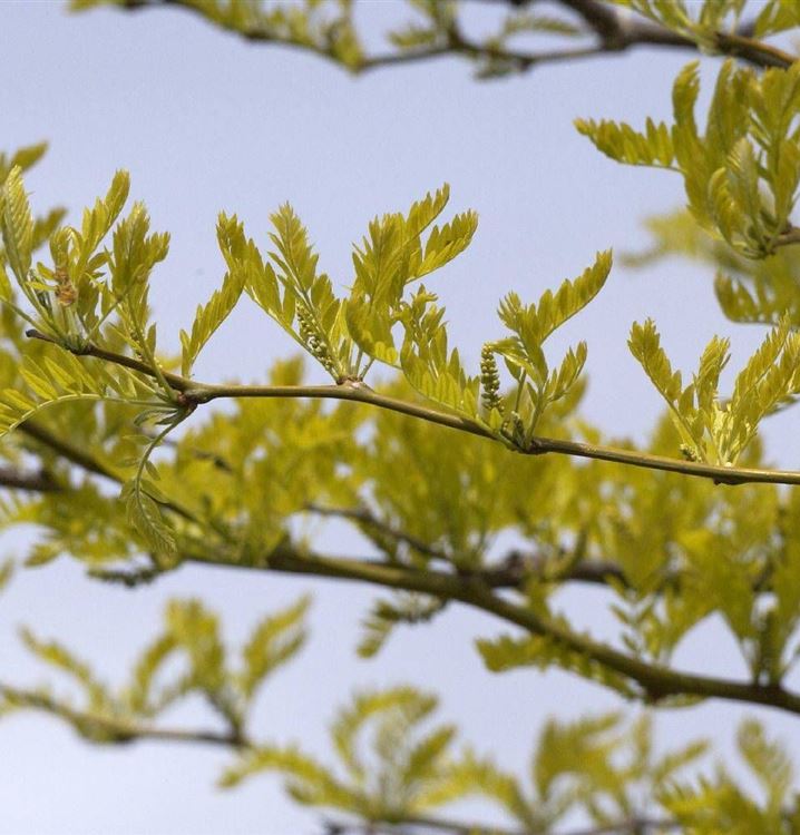 Nach einem Austrieb in Goldgelb nehmen die gefiederten Blätter eine hellgrüne Farbe an. Dabei sind sie etwa 3 cm bis 4 cm gross. Vor dem Laubfall nehmen sie schöne bernsteingelbe Farbtöne an.