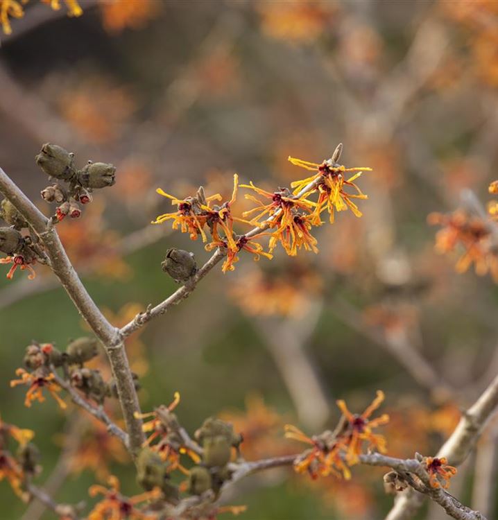Die Blütezeit beginnt für die Zaubernuss 'Aphrodite' ab Februar. Dann trägt sie orangefarbene Blüten. Bis April hält die Blüte an.