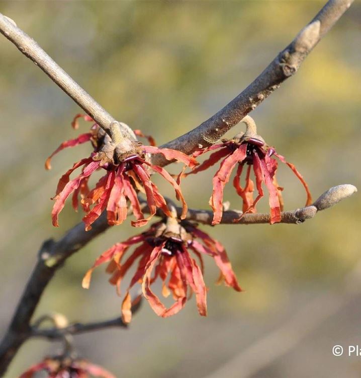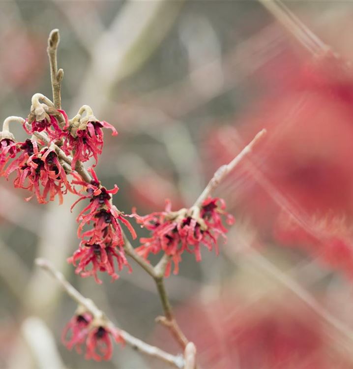 Die Blütezeit beginnt für die Zaubernuss 'Diane' ab Januar. Dann trägt sie rote Blüten. Noch dazu verströmen sie einen leichten Duft. Bis Februar hält die Blüte an.