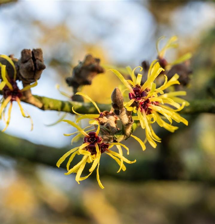 Die Blütezeit beginnt für die Zaubernuss 'Westerstede' ab Februar. Dann trägt sie gelbe Blüten. Bis März hält die Blüte an.