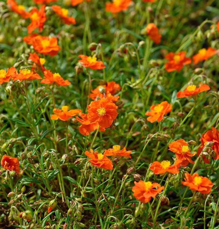 Stauden sind in der Gartengestaltung fast ein Muss, gibt es doch für nahezu jeden Standort die passenden Pflanzen. Das Garten-Sonnenröschen 'Bronzeteppich' (Helianthemum cultorum 'Bronzeteppich') ist zum Beispiel eine hervorragende Steingartenpflanze, genauso wie es in Blumenkübeln eine gute Figur macht. Mit seinen schalenförmigen Blüten in Orange ist das Garten-Sonnenröschen 'Bronzeteppich' von Mai bis Juli ein Blickfang. Dabei ist es nicht nur eine Augenweide, denn seine Blüten werden auch gerne von Bienen und anderen Insekten angeflogen. Seine eiförmigen Blätter tragen ebenso zu seiner Wirkung bei. Sie sind grau-grün gefärbten. Da es sich um eine immergrüne Staude handelt, sorgen die Blätter auch im Winter für farbliche Akzente.