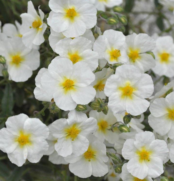 Stauden sind in der Gartengestaltung fast ein Muss, gibt es doch für nahezu jeden Standort die passenden Pflanzen. Das Garten-Sonnenröschen 'Eisbär' (Helianthemum 'Eisbär') ist zum Beispiel eine hervorragende Steingartenpflanze, genauso wie es in Blumenkübeln eine gute Figur macht. Mit seinen schalenförmigen Blüten in Weiss ist das Garten-Sonnenröschen 'Eisbär' von Mai bis August ein Blickfang. Dabei ist es nicht nur eine Augenweide, denn seine Blüten werden auch gerne von Bienen und anderen Insekten angeflogen. Seine lanzettlichen Blätter tragen ebenso zu seiner Wirkung bei. Sie sind silbergrau gefärbten. Da es sich um eine immergrüne Staude handelt, sorgen die Blätter auch im Winter für farbliche Akzente.