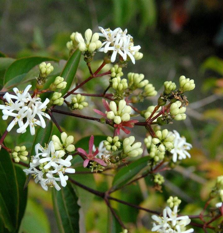 3.5 m; wintergrün; Blüte: crème, Aug.-Okt.; sonnig/halbsch.