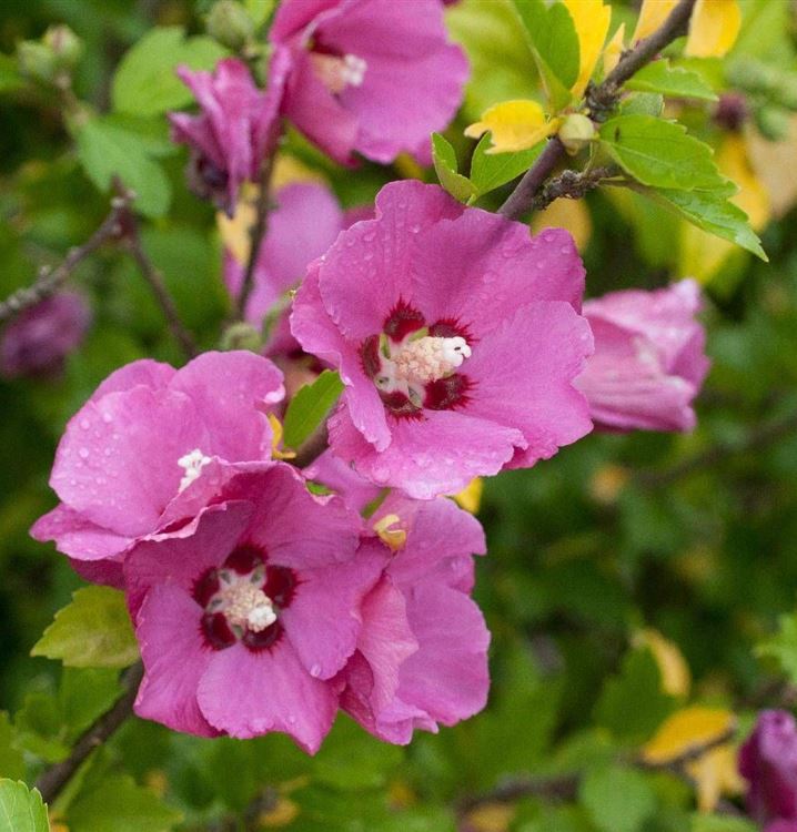 Der Garteneibisch 'Woodbridge' (Hibiscus syriacus 'Woodbridge') ist ein wunderbares, interessantes Gehölz. Seine eiförmigen, gelappten Blätter machen ihn unverwechselbar. Sie sind schön mittelgrün gefärbt. Seine schalenförmigen Blüten, die er von Juli bis September trägt, sind magenta. Übrigens sind die Blüten sehr beliebt bei Bienen und anderen Insekten.