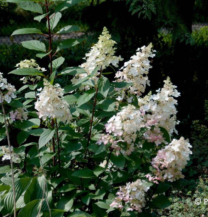 Die Rispenhortensie 'Pinky Winky'® (Hydrangea paniculata 'Pinky Winky'®) ergibt sowohl als schöner Solitär, aber auch in Gruppen ein stimmiges Bild, aber auch eine Pflanzung in Kübeln auf Balkon oder Terrasse ist möglich. Ihre lanzettlichen Blätter machen sie unverwechselbar. Sie sind schön mittelgrün gefärbt. Ihre Blüten, die sie von Juli bis September trägt, sind weiss, später rosa und verbreiten noch dazu einen angenehmen Duft.