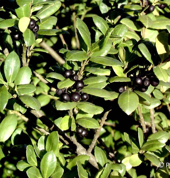 2 m; immergrün; Früchte: schwarz; sonnig/halbschattig