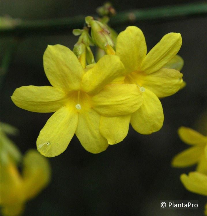 Die Blütezeit beginnt für den Echten Winter-Jasmin ab Dezember. Dann trägt er 2,5 cm bis 3 cm grosse, radförmige, gelbe Blüten. Bis April hält die Blüte an.