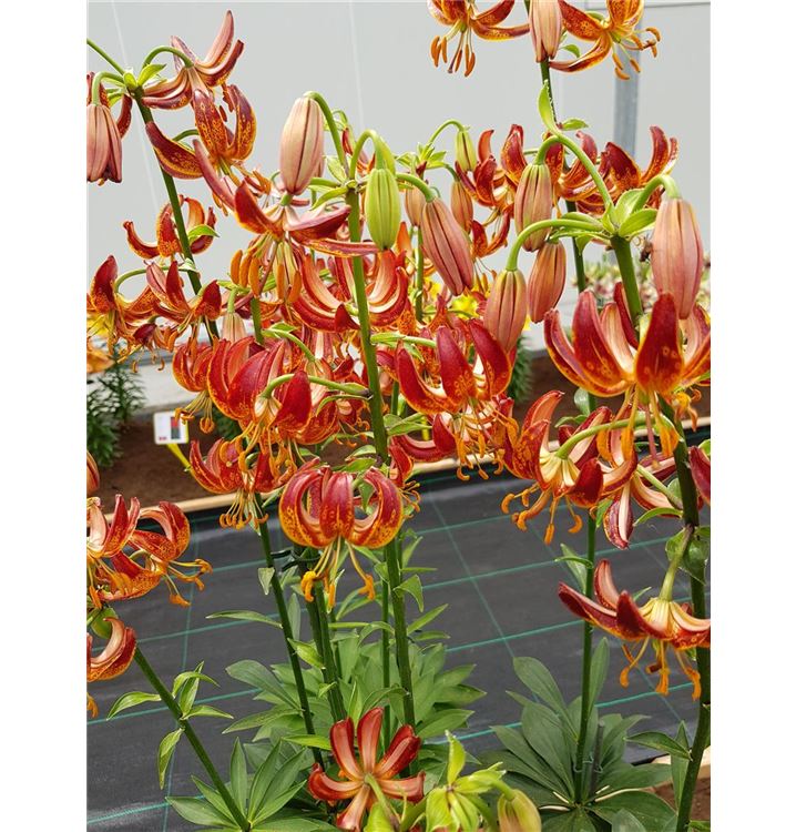 In schön bepflanzten Rabatten, aber auch in Kübeln auf der Terrasse oder in Kästen auf dem Balkon ist die Türkenbund-Lilie 'Arabian Knight' (Lilium martagon 'Arabian Knight') immer wieder gern gesehen. Mit ihren trichterförmigen Blüten in Rot-braun trägt die Türkenbund-Lilie 'Arabian Knight' von Juni bis Juli auf ihre Weise zur Gestaltung bei. Dabei ist sie nicht nur eine Augenweide, denn sie verbreitet auch noch einen angenehmen Duft.