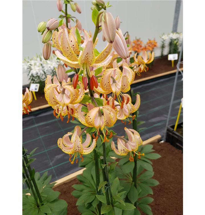 In schön bepflanzten Rabatten, aber auch in Kübeln auf der Terrasse oder in Kästen auf dem Balkon ist die Türkenbund-Lilie 'Guinea Gold' (Lilium martagon 'Guinea Gold') immer wieder gern gesehen. Mit ihren trichterförmigen Blüten in Gelb-braun trägt die Türkenbund-Lilie 'Guinea Gold' von Juni bis Juli auf ihre Weise zur Gestaltung bei. Dabei ist sie nicht nur eine Augenweide, denn sie verbreitet auch noch einen angenehmen Duft und wird gerne von Bienen und anderen Insekten angeflogen. Als Grundlage dienen dabei ihre lanzettlichen Blätter in Mittelgrün.