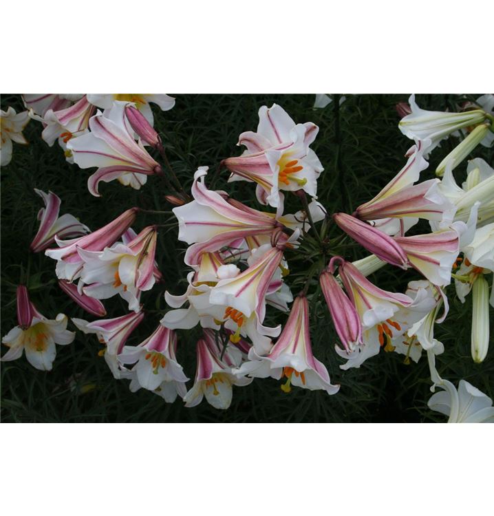 Mindestabnahme 5 Stück weisse trichterförmige Blüten mit weinrotem bis braunem Streifen an der Aussenseite, 100-125cm, Juli