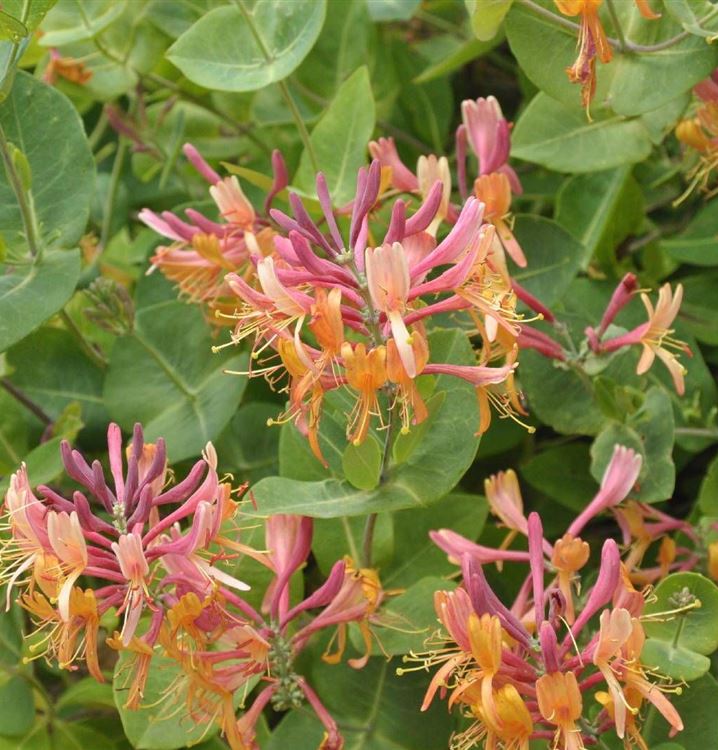 Langweilige Fassaden müssen nicht sein, mit der Geissschlinge 'Goldflame' (Lonicera heckrottii 'Goldflame') lassen sie sich interessant begrünen. Ihre eiförmigen Blätter machen sie unverwechselbar. Sie sind schön blau-grün gefärbt. Ihre röhrenförmigen Blüten, die sie von Juni bis September trägt, sind purpurrot und verbreiten noch dazu einen angenehmen Duft.