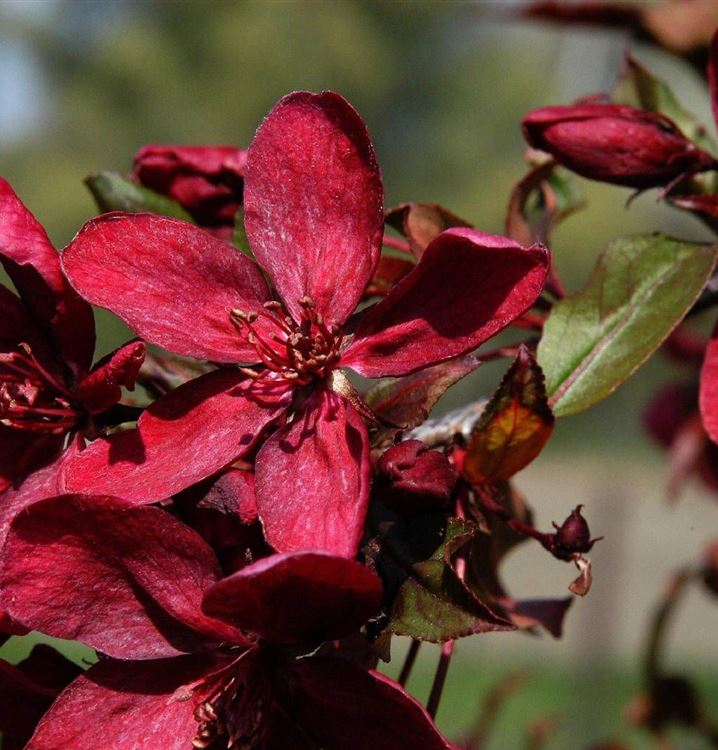 4 m; Blüte: karminrot, Mai; Frucht: dunkelrot; sonnig