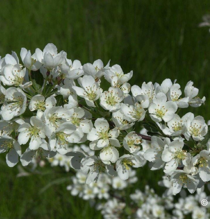 Die Blütezeit beginnt für den Zierapfel 'Tina' ab Mai. Dann trägt er schalenförmige, weisse Blüten.