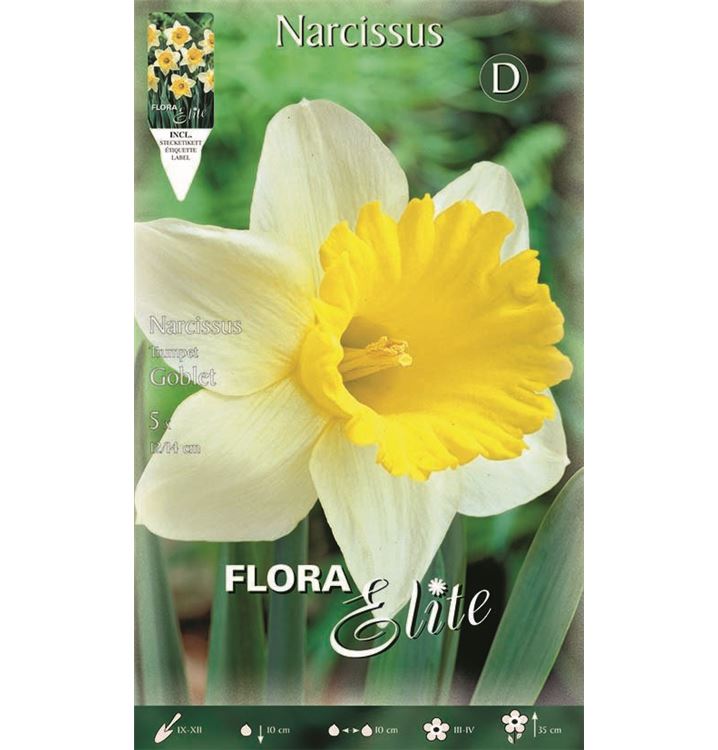 Die Blütezeit beginnt für die Trompeten-Narzisse 'Goblet' ab April. Dann trägt sie Trauben mit radförmigen bis röhrenförmigen, gelb-weissen Blüten. Noch dazu verströmen sie einen angenehmen Duft.