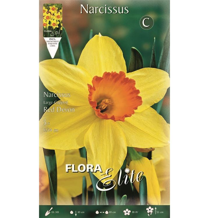 Die Blütezeit beginnt für die Grosskronigen Narzisse 'Red Devon' ab März. Dann trägt sie Trauben mit radförmigen bis röhrenförmigen, weissen, gelben, orangefarbenen oder orange-roten Blüten. Noch dazu verströmen sie einen angenehmen Duft. Bis April hält die Blüte an.