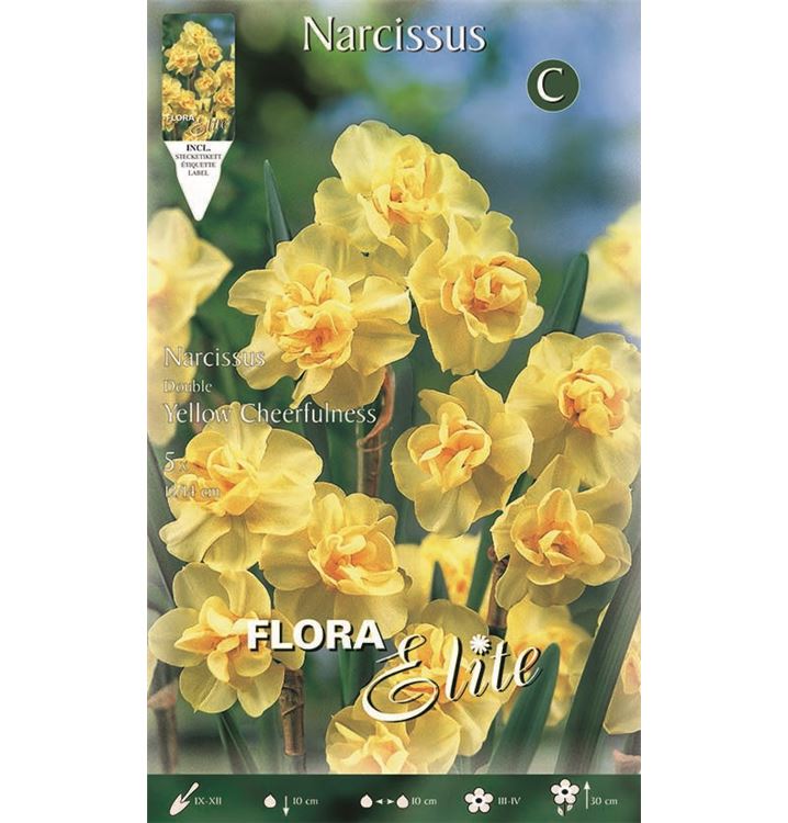 Die Blütezeit beginnt für die Narzisse 'Yellow Cheerfulness' ab April. Dann trägt sie Trauben mit radförmigen bis röhrenförmigen, weissen, gelben, orangefarbenen oder zitronengelben Blüten. Noch dazu sind sie gefüllt und verströmen einen angenehmen Duft.