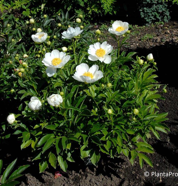 Im Beet ist die Garten-Pfingstrose 'Jan van Leeuwen' (Paeonia lactiflora 'Jan van Leeuwen') besonders in Einzelstellung ein Prachtexemplar, macht aber auch in Blumenkübeln eine gute Figur. Mit ihren schalenförmigen, halbgefüllten Blüten in Weiss-gelb ist die Garten-Pfingstrose 'Jan van Leeuwen' von Mai bis Juni ein Blickfang. Doch sie ist nicht nur eine Augenweide, denn die Blüten verbreitet auch noch einen angenehmen Duft. Ihre gefingerten Blätter tragen ebenso zu ihrer Wirkung bei. Sie sind dunkelgrün gefärbten.