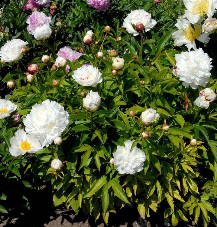 Pflanzenkombinationen machen sich immer besonders gut. Für die Nachbarschaft der Garten-Pfingstrose 'Shirley Temple' eignet sich zum Beispiel Lilie und Grossblumige Garten-Margerite.