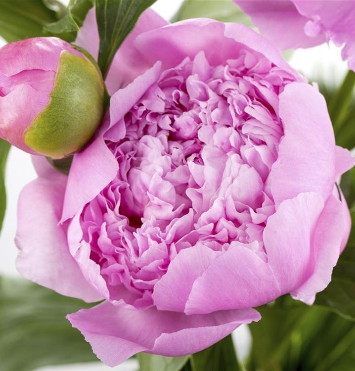 Die Blütezeit beginnt für die Garten-Pfingstrose 'Monsieur Jules Elie' ab Mai. Dann trägt sie schalenförmige, rosafarbene Blüten. Noch dazu verströmen sie einen angenehmen Duft. Bis Juni hält die Blüte an.