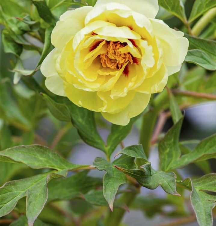 Die Blütezeit beginnt für die Strauch-Pfingstrose ab Mai. Dann trägt sie 20 cm bis 30 cm grosse, gelbe Blüten. Noch dazu sind sie gefüllt und verströmen einen leichten Duft. Bis Juni hält die Blüte an.