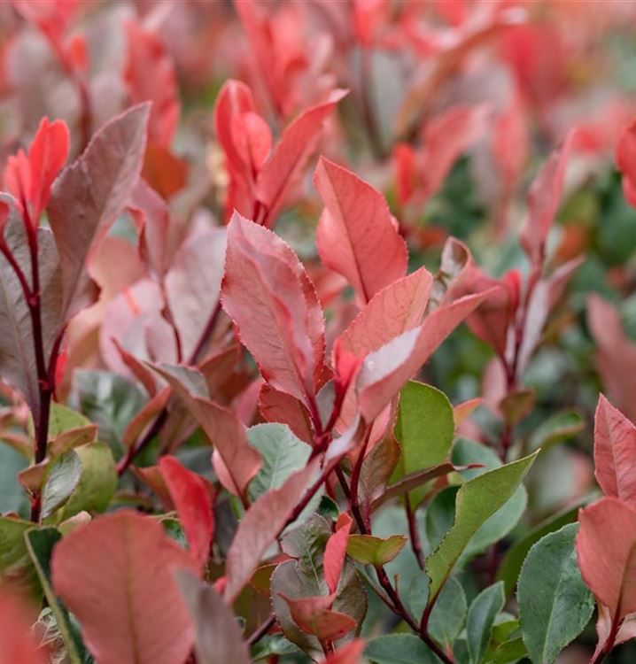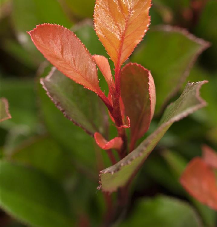 Für den Einsatz als Heckenpflanze ist die Glanzmispel 'Little Red Robin' (Photinia fraseri 'Little Red Robin') ideal, sie ist aber auch ein prächtiger Solitär im Garten, genauso wie sie wunderbar in Kübeln auf Balkon oder Terrasse gepflanzt werden kann. Ihre glänzenden, lanzettlichen Blätter machen sie unverwechselbar. Sie sind, nach einem roten Austrieb, schön dunkelgrün gefärbt. Da es sich um ein immergrünes Gehölz handelt, sorgen die Blätter auch im Winter für farbliche Akzente. Ihre Blüten, die sie von Mai bis Juni trägt, sind weiss. Ab September trägt sie rote Früchte, die sehr dekorativ wirken.