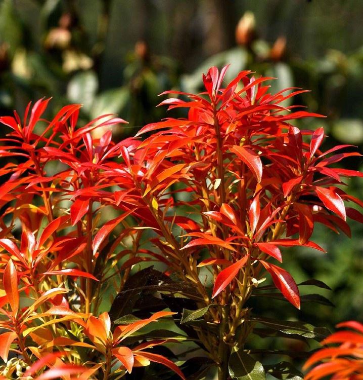 Im Einzelstand ist das Schattenglöckchen 'Forest Flame' (Pieris japonica 'Forest Flame') eine prächtige Erscheinung, aber auch eine Pflanzung in Kübeln auf Balkon oder Terrasse ist möglich. Seine glänzenden, lanzettlichen Blätter machen es unverwechselbar. Sie sind, nach einem roten Austrieb, schön dunkelgrün gefärbt. Da es sich um ein immergrünes Gehölz handelt, sorgen die Blätter auch im Winter für farbliche Akzente. Seine Blüten, die es von März bis Mai trägt, sind weiss. Übrigens sind die Blüten sehr beliebt bei Bienen und anderen Insekten. Ab August trägt es runde, hellbraune Früchte.