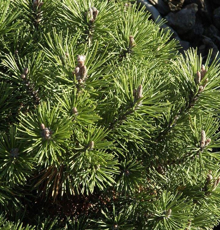 Die Kugel-Kiefer 'Mops' (Pinus mugo 'Mops') ist ein dekoratives Ziergehölz, das im Einzelstand eine besondere Wirkung erzielt, doch auch in Gruppen zusammengepflanzt ergibt sich ein stimmiges Bild und auch eine Pflanzung in Kübeln auf Balkon oder Terrasse ist möglich. Ihre Nadeln machen sie unverwechselbar. Sie sind schön mittelgrün gefärbten. Da es sich um ein immergrünes Gehölz handelt, sorgen die Nadeln auch im Winter für farbliche Akzente. Ihre Blüten, die sie von Juni bis Juli trägt, sind rosarot. Ab Oktober trägt diese Konifere kegelförmige, braun-gelbe Zapfen.