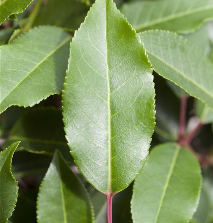 Für den Einsatz als Heckenpflanze ist die Portugiesische Lorbeerkirsche 'Angustifolia' (Prunus lusitanica 'Angustifolia') ideal, sie ist aber auch ein beliebtes Ziegehölz in der Gartengestaltung, genauso wie sie wunderbar in Kübeln auf Balkon oder Terrasse gepflanzt werden kann. Ihre glänzenden, lanzettlichen, gezähnten Blätter machen sie unverwechselbar. Sie sind schön dunkelgrün gefärbt. Da es sich um ein immergrünes Gehölz handelt, sorgen die Blätter auch im Winter für farbliche Akzente. Ihre Blüten, die sie von Juni bis Juli trägt, sind weiss. Ab September trägt sie ovale, schwarze Früchte.