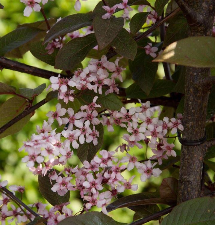 5 m; Blattfarbe: rotgrün; Blüte: rosa, Mai; sonnig