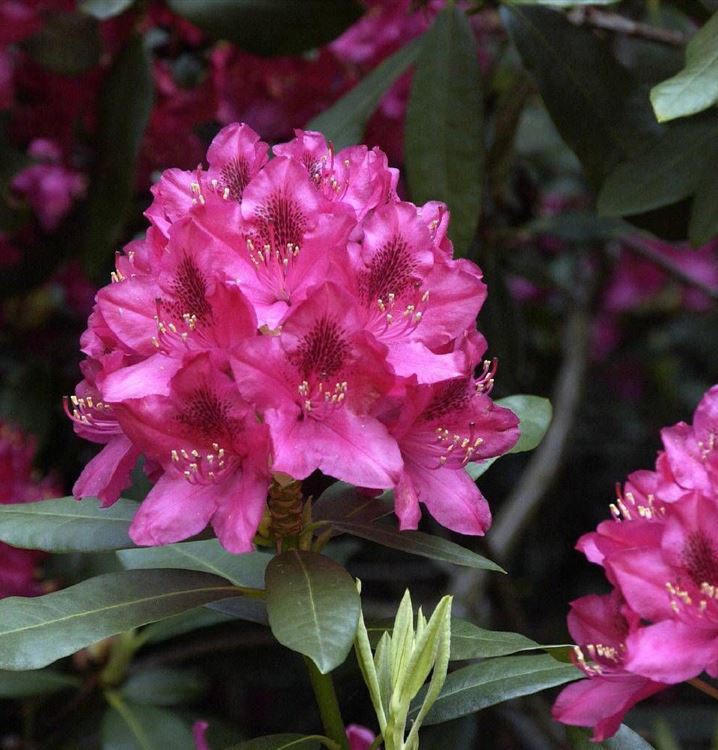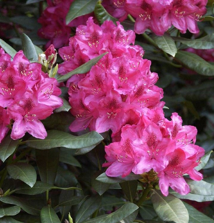 Der Rhododendron 'Nova Zembla' (Rhododendron 'Nova Zembla') ist in Einzelstellung ein dekorativer Solitär im Garten. Dabei sind es besonders seine trichterförmigen Blüten, die ihn von Ende Mai bis Mitte Juni unverwechselbar machen, mit ihrer purpurroten Färbung und der schwarzen Zeichnung. Die lanzettlichen Blätter des immergrünen Laubwerks präsentieren sich in schönem Dunkelgrün.