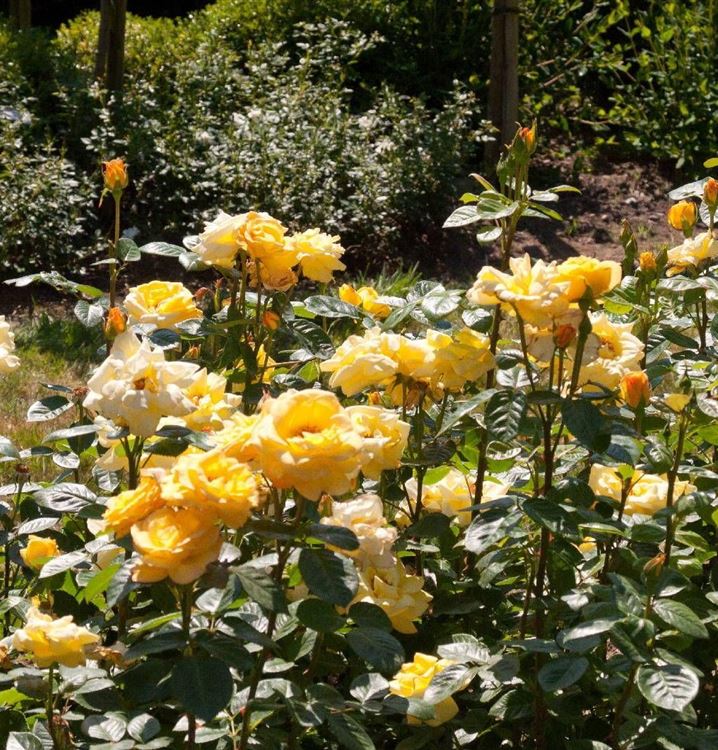 Dem Ruf die Königin der Blumen zu sein wird die Beetrose 'Arthur Bell'® (Rosa 'Arthur Bell'®) ohne Anstand gerecht. Vor allem sind es ihre schalenförmigen, goldgelben Blüten, die diese Wirkung erzeugen. Sie trägt sie von Juni bis September.