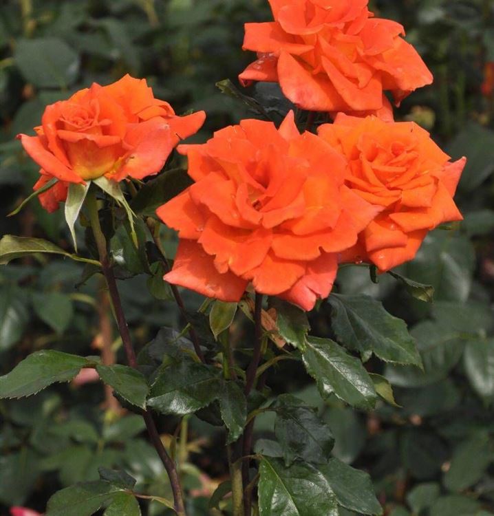 Dem Ruf die Königin der Blumen zu sein wird die Edelrose 'Christophe Colomb'® (Rosa 'Christoph Colomb'®) ohne Anstand gerecht. Vor allem sind es ihre schalenförmigen, gefüllten, orange-roten Blüten, die diese Wirkung erzeugen. Sie trägt sie von Juni bis Oktober und lässt sie einen angenehmen Duft verströmen.