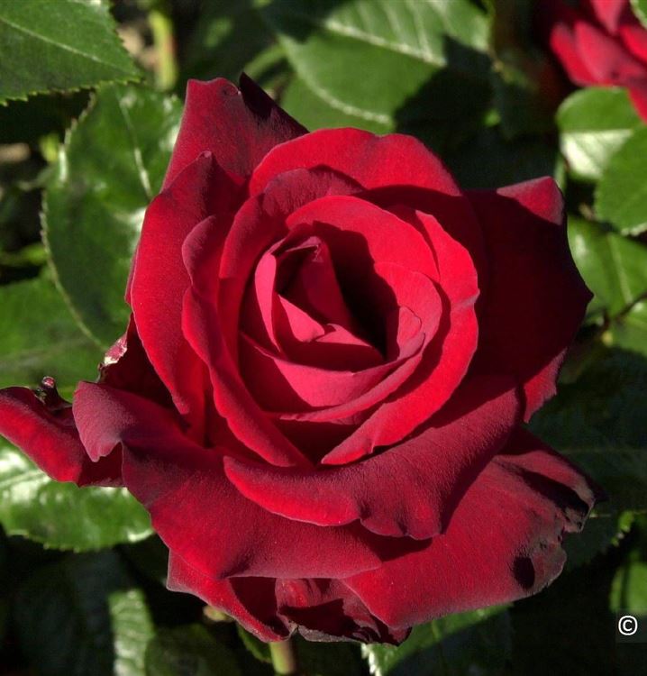 Dem Ruf die Königin der Blumen zu sein wird die Edelrose 'Ingrid Bergmann'® (Rosa 'Ingrid Bergmann'®) ohne Anstand gerecht. Vor allem sind es ihre schalenförmigen, gefüllten, roten Blüten, die diese Wirkung erzeugen. Sie trägt sie von Juni bis Oktober und lässt sie einen leichten Duft verströmen. Dazu zeigt sich ihr dunkelgrünes, gefiedertes Laub sehr Robust gegenüber Blattkrankheiten.