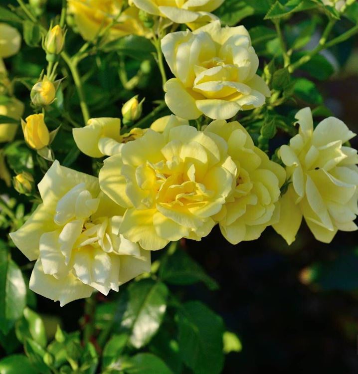 Die Blütezeit beginnt für die Kleinstrauchrose 'Loredo'® ab Juni. Dann trägt sie Dolden mit schalenförmigen, gelben Blüten. Noch dazu sind sie halbgefüllt und verströmen einen leichten Duft. Bis Oktober hält die Blüte an.